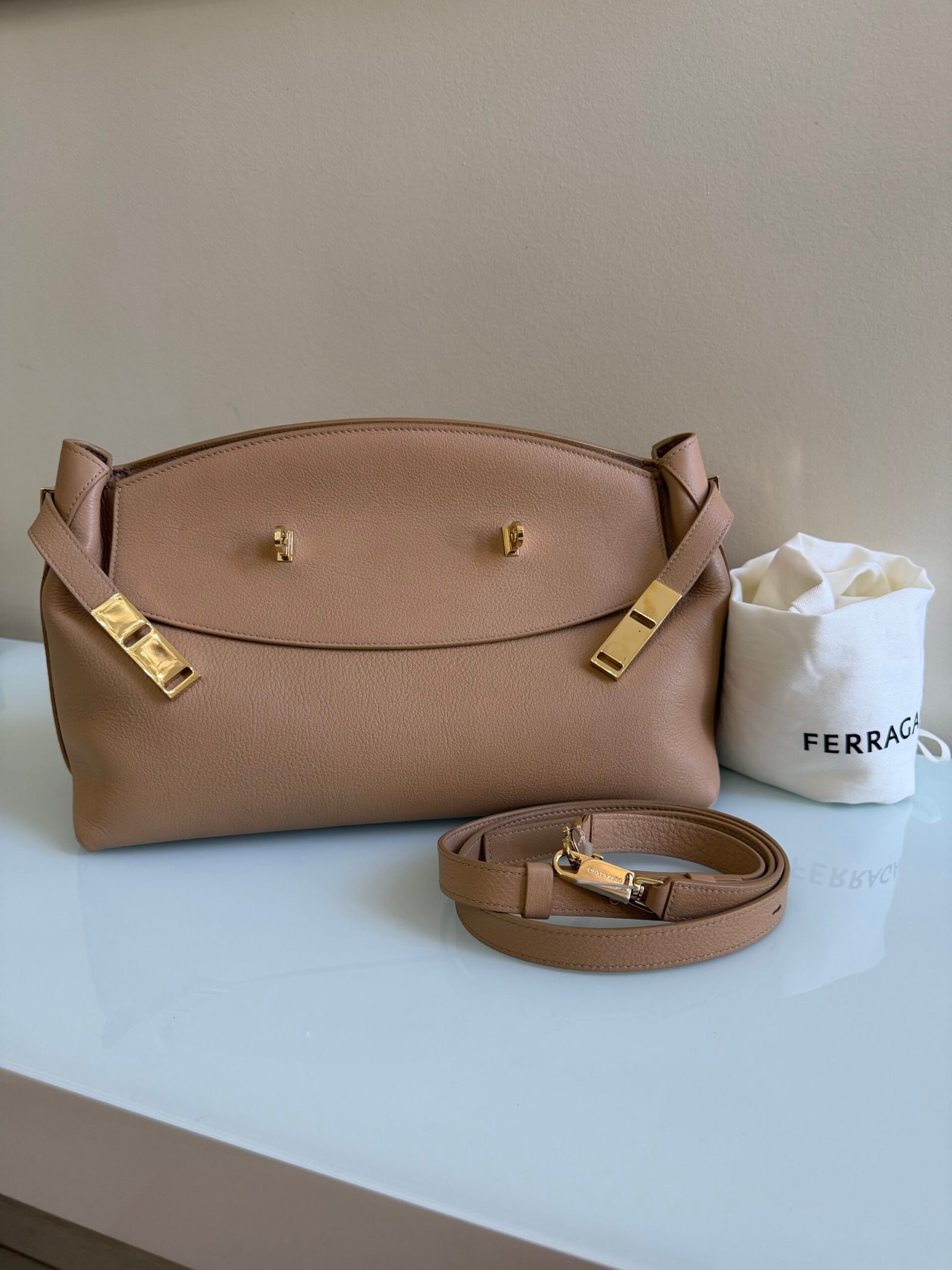 Ferragem dourada, fivela Gancini, fecho magnético oculto, fechamento por zíper na parte superior e compartimento principal.